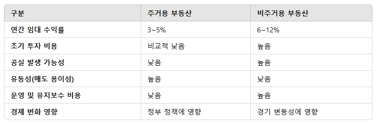 💡 결론: 주거용 부동산은 안정적인 현금 흐름을 제공하며, 공실 위험이 적어 장기적인 투자에 적합합니다.