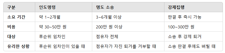 4. 법적 대응 방법: 인도명령 vs 명도 소송 vs 강제집행 비교