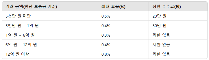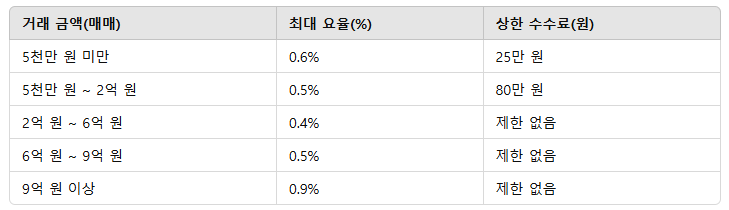 - 거래 유형(매매, 전세, 월세)에 따라 요율이 다름